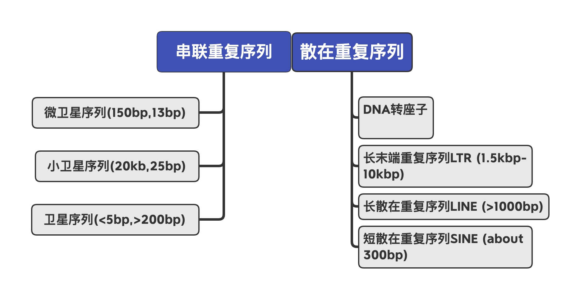 重复序列根据序列特征分为2类:串联重复(Tandem repeats)和散布重复(Dispersed repeats)